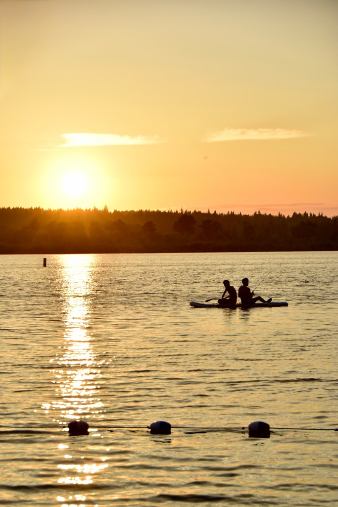 As the sun dipped behind the trees on Lake Sammamish, the entire scene was bathed in a warm, golden glow. Two guys sat back-to-back on a paddleboard, fishing quietly in the middle of the lake. Paddleboarding is a beloved activity in Washington, and fishing is just as popular. The peaceful evening vibes—serene, calm, and warm—made the moment feel like it could last forever.