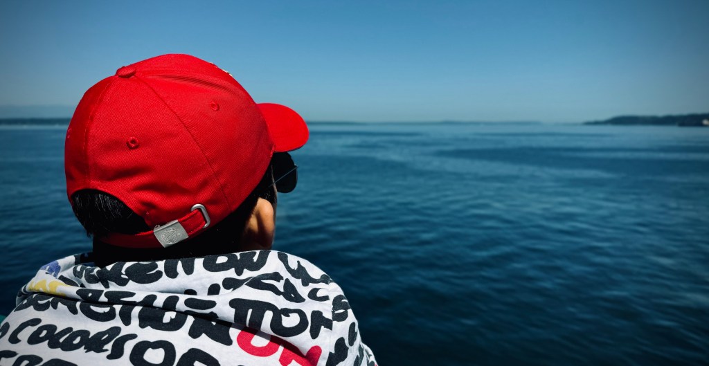 I watched my brother from the ferry railing as he stared out into the distance over the Puget Sound. He had his arms folded, gazing into the horizon as if deep in thought. I couldn’t help but wonder what was on his mind. Was it the mesmerizing blue waters or the distant coastline? Perhaps it was just the peace that comes from being on the water. His bright red cap contrasted against the deep blue of the Sound, making for a perfect shot as we made our way across the water, with the faint outline of the coast behind us.