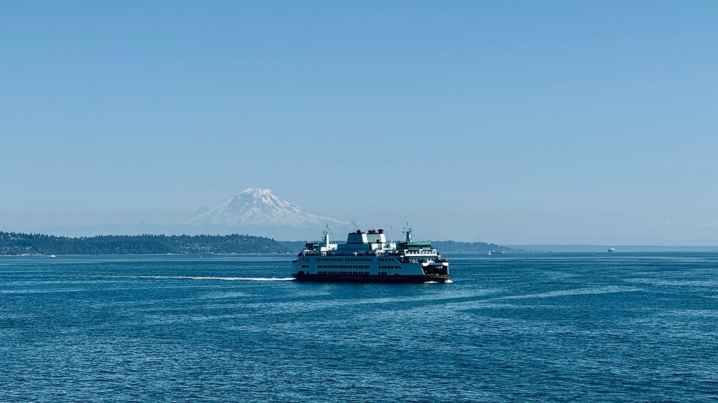 The view of Mount Rainier from the Puget Sound is nothing short of awe-inspiring. From the middle of the Sound, you can see the Washington State Ferry cutting through the waters, creating a perfect stream behind it as it heads towards the horizon. The bright blue waters, with Mount Rainier in full glory, capture that “peak day” vibe you can only get on a perfect, clear day in Washington. The ferry, a staple mode of transport for both locals and tourists, reflects the spirit of the state—a beautiful mix of urban accessibility and natural wonder, all against the backdrop of one of Washington’s most iconic landmarks.